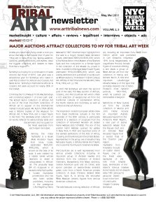 MayMai2011VOLUME25www.arttribalnews.comNYCTRIBALARTWEEKMarketINSIGHTmarktInsightcuturaffairsrviwsgaFrontintrviwsobjctsadsArtTribalNewsletterLLC2011AllinformationandimagesincludedarepropertyofArtTribalNewsletterLLCandshallnotbereproducedorusedinanywaywithouttheproperexpressedwrittenconsent.Phone1888832-9285MAJORAUCTIONSATTRACTCOlleCTORSTONYFORTRIBAlARTWeeKUnlessyouhavebeenlivingunderarockyouknowthatMayisthebusiesttimeofyearforTribalArtinNewYorkCity.SpringweatherauctionsgalleryexhibitionsandeventsdrawthebiggestcollectorsanddealerstoNewYorklikeamagnet.Sothebysishopingforacontinuationofsalesrecordslikethoseof2010.LastyearwasasensationalyearforSothebyswhorakedinover33.8millionforAfricanandOceanicArtSalesalone.SothebysInternationalAfricanOceanicArtsalesaccountfornearly85ofthemarket.OnFridaythe13ofMayat1000AMSothebyswillcommencesession1ofatwopartsale.TheRobertRubinCollectionofAfricanArtisoneofthemostimportantcollectionsofAfricanarttoappearontheinternationalmarketinrecentyears.Mr.Rubin1934-2009wasalifetimetrusteeoftheMuseumforAfricanArtinNewYorkandamajorfigureinthefield.Therelativelysmallcollectionof50worksreflectshisextraordinarytasteanddiscernmentandhisquestforthefinestexamplesfromeachregionandstyle.AmongthemanyhighlightsisaBauleMaleAncestorFigurefromIvoryCoastestimated600000-900000whichisknownasthebestofitstype.ItwascreatedbyamastercarverwhoseattentiontodetailisunsurpassedinAfricanart.Theunusuallylarge24insculptureisofexceptionallyhighquality.ItboastsimpressiveprovenanceandhasalsobeenwidelypublishedincludingintheprestigiousLArtNegrbyPierreMeauzin1967.AnothermajorhighlightfromthesaleisaDogonNduleriMaleAncestorFigureestimated200000-300000whichistheName-PieceoftheMasteroftheSlantedEyesandthecompaniontoafemalefigureinthecollectionoftheMuseduLouvreinParis.InadditionASongyeMalePowerFigureestimated150000-250000whichwaswidelyexhibitedandpublishedinworkssuchasWilliamRubinsPrimitivismin20thCenturyArtAffinityoftheTribalandtheModernNewYork1984volIp.159.At200PMSothebyswillstartthesecondpartofthesaleTheMayauctionofAfricanOceanicandPre-ColumbianArtwhichoffersarichselectionofexceptionalartfromthetraditionalculturesofsub-SaharanAfricathePacificIslandsandIndonesiaaswellasCentralandSouthAmerica.TheinspirationmodernEuropeanartistsdrewfromthesetraditionalculturesinthefirstdecadesofthe20thcenturyisparticularlyevidentinaselectionofsculpturefromthecollectionofrenownedModernartdealerPierreMatisselots167-202.ThesonofthepainterHenriMatisseopenedhisgalleryinNewYorkin1931andlaunchedsomeoftheearliestexhibitionsoftheArtsofAfricaOceaniaandtheAmericasintheUnitedStates.RepresentedinthegroupareabeautifulFangReliquaryFigureastrikingKanakRoofSpireandasublimeTeotihuacanGreenstoneMask.Pre-ColumbianartiswellrepresentedfromvariousprivatecollectionsincludinganimportantgroupofAndeantextilesandceramicsfromthecollectionofRolandHartmannSwitzerlandfineMayaceramicsCentralAmericangoldandanOlmecjadespoonpendantofextraordinaryemeraldgreencolorfromaNorthAmericanprivatecollection.AlargeChinescoSeatedMaleFigureTypeAisamongtheevocativeWestMexicanceramicfiguresfromvariousAmericancollections.ThesalefeaturesastrongselectionofAfricanartincludinganimportantPunuMaskfromGabonwhichwaspublishedinCarlEinsteinsinfluential1915bookNegerplastik.AmagnificentYorubaFemaleFigureofawomanofferingaramleadsagroupofWestAfricanartfromthecollectionofNancyandRichardBloch.ArareandimportantLuba-SongyekifwebeMaskisofthetypethatprobablyinspiredoneofPabloPicassosmostdynamicperiods1907-1908whenhepaintedLesDemoisellesdAvignon.SelectionsofNewGuineaartfromtheJOLIKAcollectionofMarciaandJohnFriedeincludeanimportantAdjirabReliquaryFigurefromthePoraporaRiverRegionararepairofElemaBarkclothMasksfromthePapuanGulfandanintricateMaleAncestorFigurefromasacredfluteoftheChambriLakeregion.HighlightsfromPolynesiaincludeanEasterIslandFigureoneofthefinestearlyexamplesoftheraremoaitangatatypereminiscentoftheislandsfamousmassivestoneheadsandanelegantearly19thcenturyFijiyaquonakavabowlintheformofaseaturtle.Images-CourtesySothebys. MuseumHAPPENINGSONNOWTheAndeAnTunic400Bce1800ceThROuGhSepTemBeR182011ThemichAelc.ROckefelleRWinG1STflOORThemeTROpOliTAnmuSeumOfARTneWyORkRecOnfiGuRinGAnAfRicAnicOnOdeSTOThemASkBymOdeRnAndcOnTempORARyARTiSTSfROmThReecOnTinenTSThROuGhJune112011ThemeTROpOliTAnmuSeumOfARTneWyORkpOWeRincARnATeAllAnSTOneScOllecTiOnOfSculpTuRefROmThecOnGOmAy142011SepTemBeR42011TheBRucemuSeumGReenWichcTcenTRAlniGeRiAunmASkedARTSOfTheBenueRiveRvAlleyThROuGhJuly242011fOWleRmuSeumuclABehindTheSceneSTheReAlSTORyOfTheQuileuTeWOlveSThROuGhAuGuST142011SeATTleARTmuSeumlAfRicAdellemeRAviGlie.ARTiAfRicAnenellecOlleziOniiTAliAneThROuGhJune52011pAlAzzOducAleGenOvAiTAlydynASTyAnddiviniTyifeARTinAncienTniGeRiAThROuGhmAy222011viRGiniAmuSeumOffineARTSdOGOnApRil5-July242011muSeduQuAiBRAnly.pARiSfRAnceThemAkinGOfimAGeSThROuGhJuly172011muSeduQuAiBRAnlypARiSfRAnceARTOfTheAmeRicAnindiAnSTheThAWcOllecTiOnApRil24-SepTemBeR242011dAllASmuSeumOfARTpicASSOGuiTARS19121914feBRuARy13June62011ThiRdflOORmOmAneWyORkRichardorMoBahnmanEmailrichmojoeshaw.caByappointmentPhone604-589-8162Cell604-313-7553RichmojoegalleRy.comFnNrtwstcsteskartHaidaMountainGoatHornSpoonMid19thCenturyLength1034 MayAUCTIONSBONhAMSNeWYORKfineAfRicAnOceAnicAndpRe-cOlumBiAnARTmAy1220111pmSOTheBYSNeWYORKTheROBeRTRuBincOllecTiOnOfAfRicAnARTmAy13201110AmAfRicAnOceAnicAndpRe-cOlumBiAnARTincludinGpROpeRTyfROmThepieRReAndTAnAmATiSSefOundATiOnmAy1320112pmArtepriMitivoTRiBAlpRe-cOlumBiAnARTclASSicAleGypTiAnASiAnAnTiQuiTieSmAy232011ZeMANeK-MUNSTeR65ThTRiBAlARTAucTiOnmAy282011ThehORSeRIdeRINAFRICANARTBYGeORGeCheMeCheSpcialBooksigningvntattSotbysCocktailPartyMay112011.horssarvrrarAra.TwtobowstoSarotasotSaaraaSaowtotrgsottroaorstsbogtotgtwarroratootabrsos.dtotstottroaraorstatatstsorstrtbrsoorsssrvv.AtrraotstrsarooaogtdogodjBaaaSoatyorbao.TAa-AsatooGaaatkotooocaroagooaosaastgbrassabrozstrs.Sootartstsobarvavagtagsoaors.TsvsastgboorstsawatoAraarttgtorsatsrravartogssroeaassayorbavatostodogostrsaSoarvgs.imatBaaaBosoaSoootgrosstbrattstvasottasqra.Taatrotsboosattotartatotsstvaswa